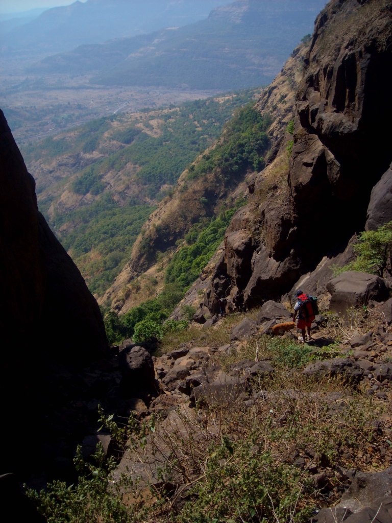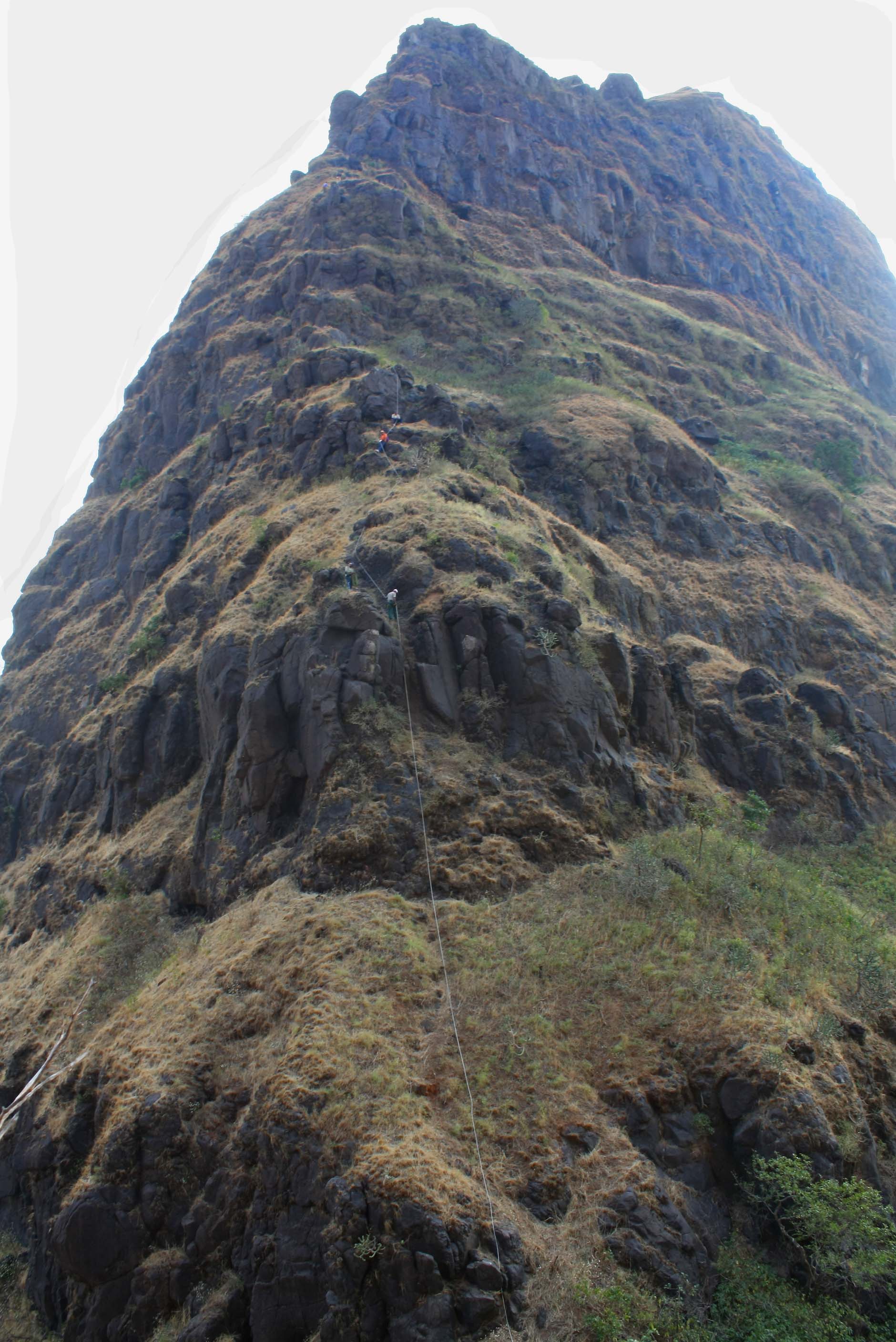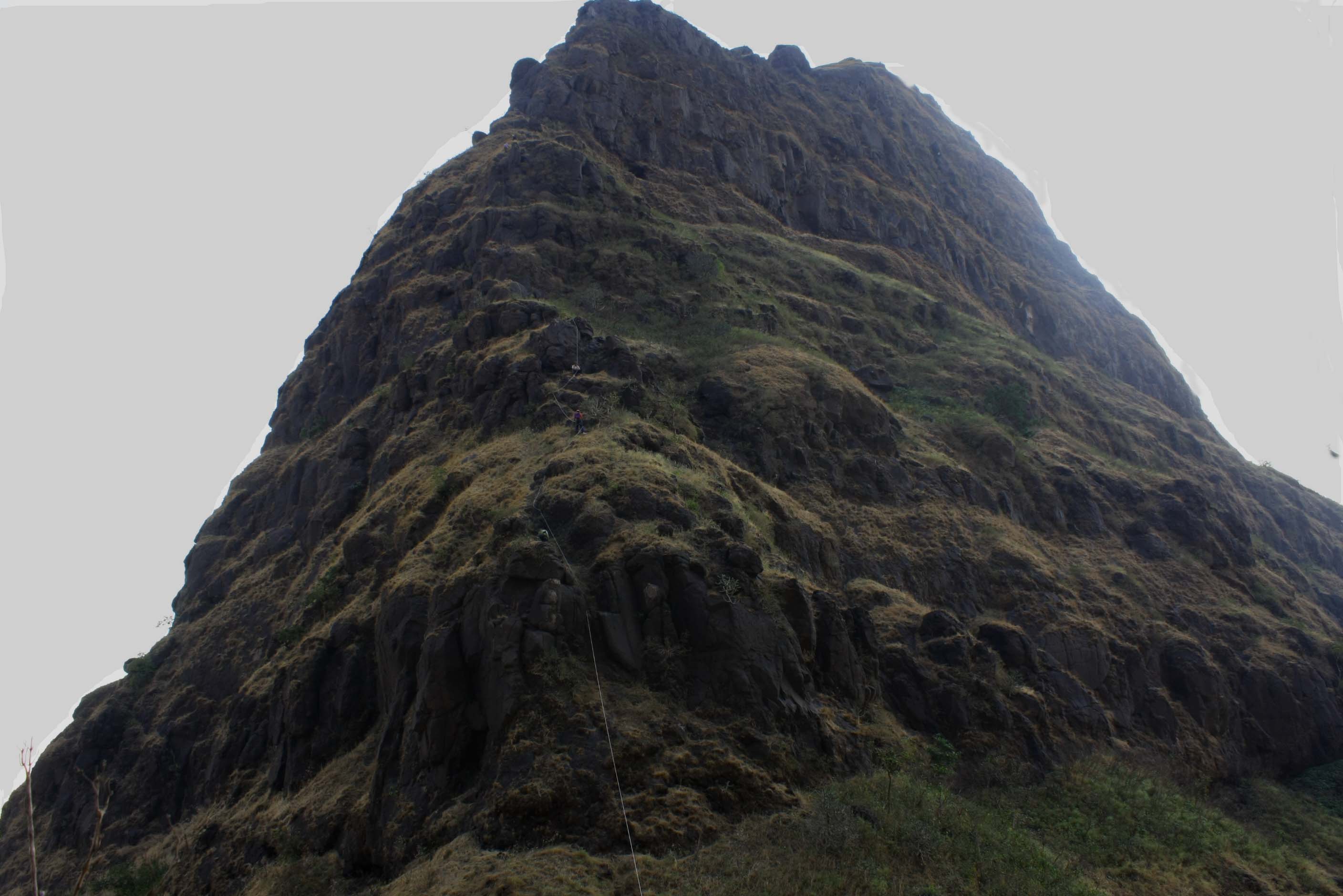 Its quite a popular climb among hard core sahyadri trekkers.The climb doesnt involve many rock pathces.Its mostly scree and loose rock.You can get the idea about its gradient from the photo(in the end).