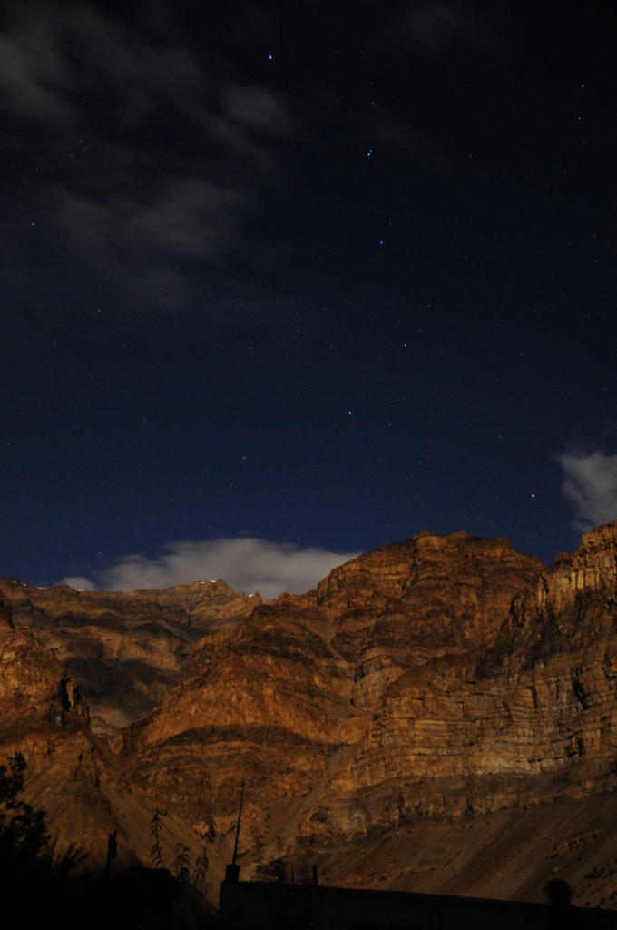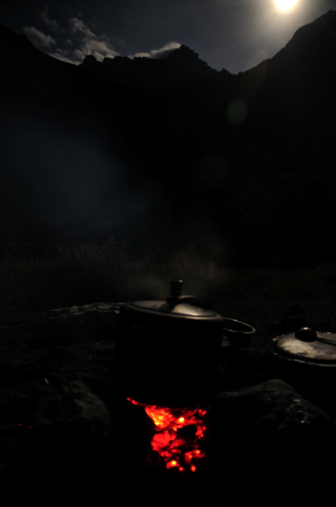 It was approaching dark and we were still 2 more hours away from Kibri.The walk that day was frequently obstructed by small river crossings which took a lot of time,forcing us to take detours to avoid the water and so on.It seemed to stretch forever.Finally,around 9 p.m,,we reached Kibri in the torchlights and here again,Kullu and the guys pointed out a fresh snow leopard pug mark in the path.We immediately scanned the mountain side along which we had been walking and to our delight,the eyes of the blue sheep shone in the torch light!The snow leopard could very well be in the same area as us but we couldn’t spot him.The donkeys were unloaded.Lamaji,Rinchin,Lufzang,Lamaji(2) and Tenzing set about the cooking part.I and Kullu wasted no time in lying down flat on our sleeping mattresses.Half an hour later,i had hot soup in my hand(god bless those Spiti people for their kindness) and khichadi for dinner.That night was beautiful.The mountain across us was brimming with beauty in the moonlight of 10 p.m.Behind,Shijibang peak,another beauty of the area,was obscuring the moon from showing up .