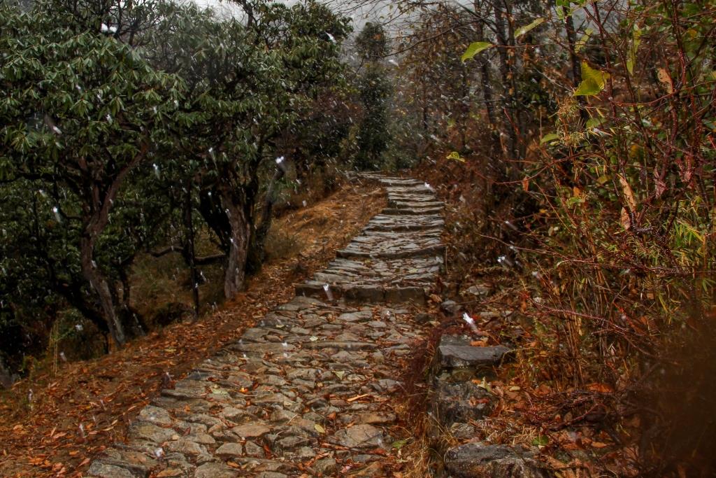 It took us an hour to reach Sari from Duggal Bitta, the progress being slowed down due to some snow and later rain, as we lost some altitude. While Duggal Batta is at around 10,000 ft altitude, Sari is only about 6550 ft above msl. It’s a beautiful little hamlet, situated in the middle of the mountains. With its small houses, terraced fields and paths going on the side of the mountain, it’s a perfect hill town for those wanting to spend some nature time and yet, not be in a commercially exploited hill station. As had been the wont for the last 3 days, we had a breakfast consisting of aloo paranthas and maggi preceded and followed by hot tea. While Ashish decided to stay back and enjoy the beauty of the village by taking a leisurely stroll through the fields, rest of us left for the short 2.5 km long hike to Deoriatal. The man made, stone laden trail for the lake starts from right across the road from Mr. Negi’s guesthouse. The trail climbs up the mountain face at the base of which the village is located. It’s a very easy hike and anyone visiting Sari should do it.