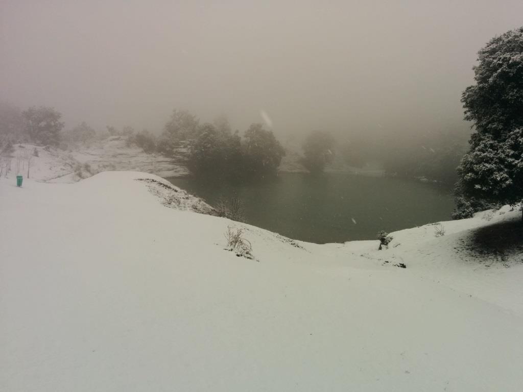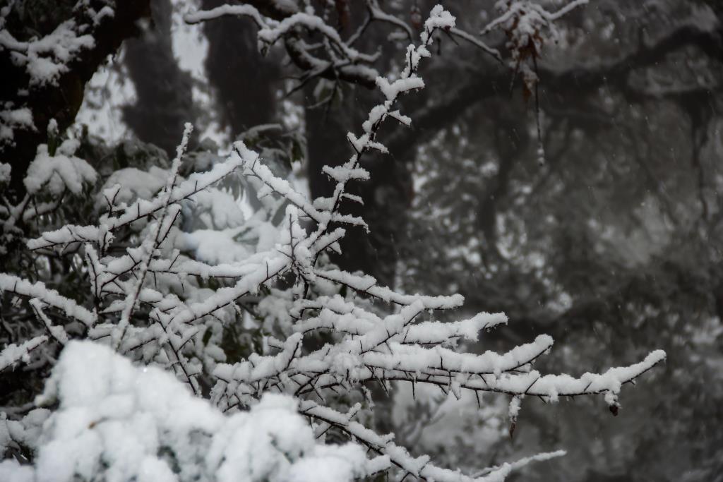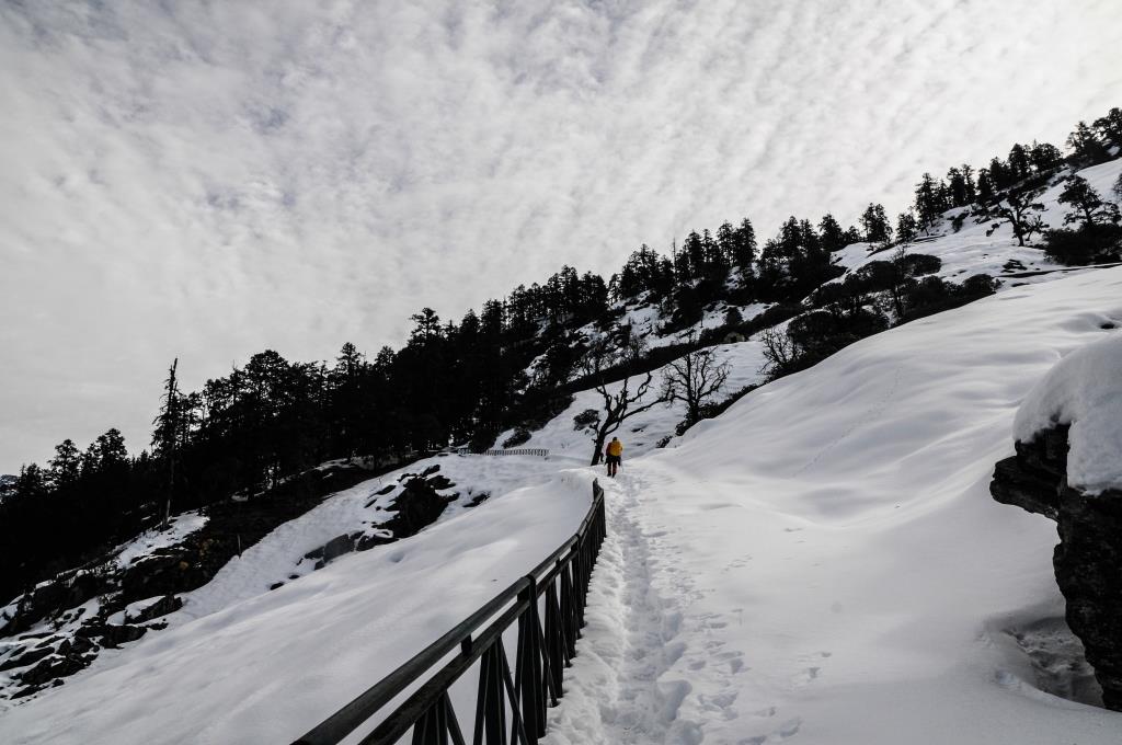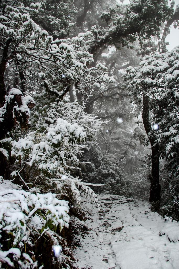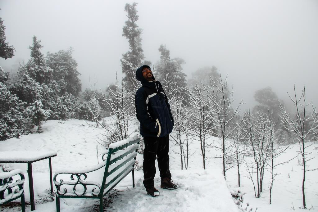 It was drizzling a little bit when we started walking. We kept a fast pace so as to lessen our hike time and thereby save ourselves from getting completely wet. But we shouldn’t have bothered. As we climbed up and gained some altitude, the rain turned into beautiful showers of snow and snowflakes. Suddenly, the path cutting through the shrubs started looking like a snowy wonderland with the fresh snow settling on the twigs, leaves and the top of our hooded jackets. We had never imagined that Deoriataal would turn into a fun hike. But snow has that quality which makes it very delightful. Clicking pictures and enjoying the snow, we reached the lake in 1.5 hours. The ground surrounding the lake was completely under snow and we spent quite some time doing a photo session in that snow. The entire thing was very joyful! The fact that we couldn’t enjoy any view beyond the lake due to fog didn’t matter as that whole area itself was so gorgeous because of the snow.
