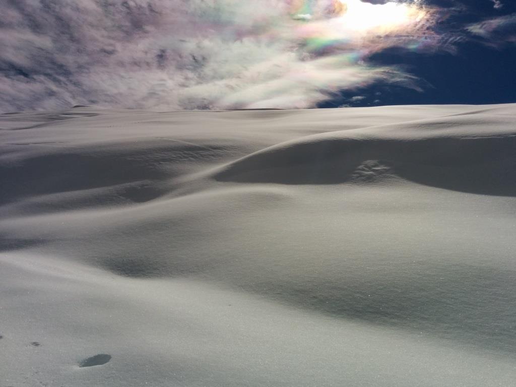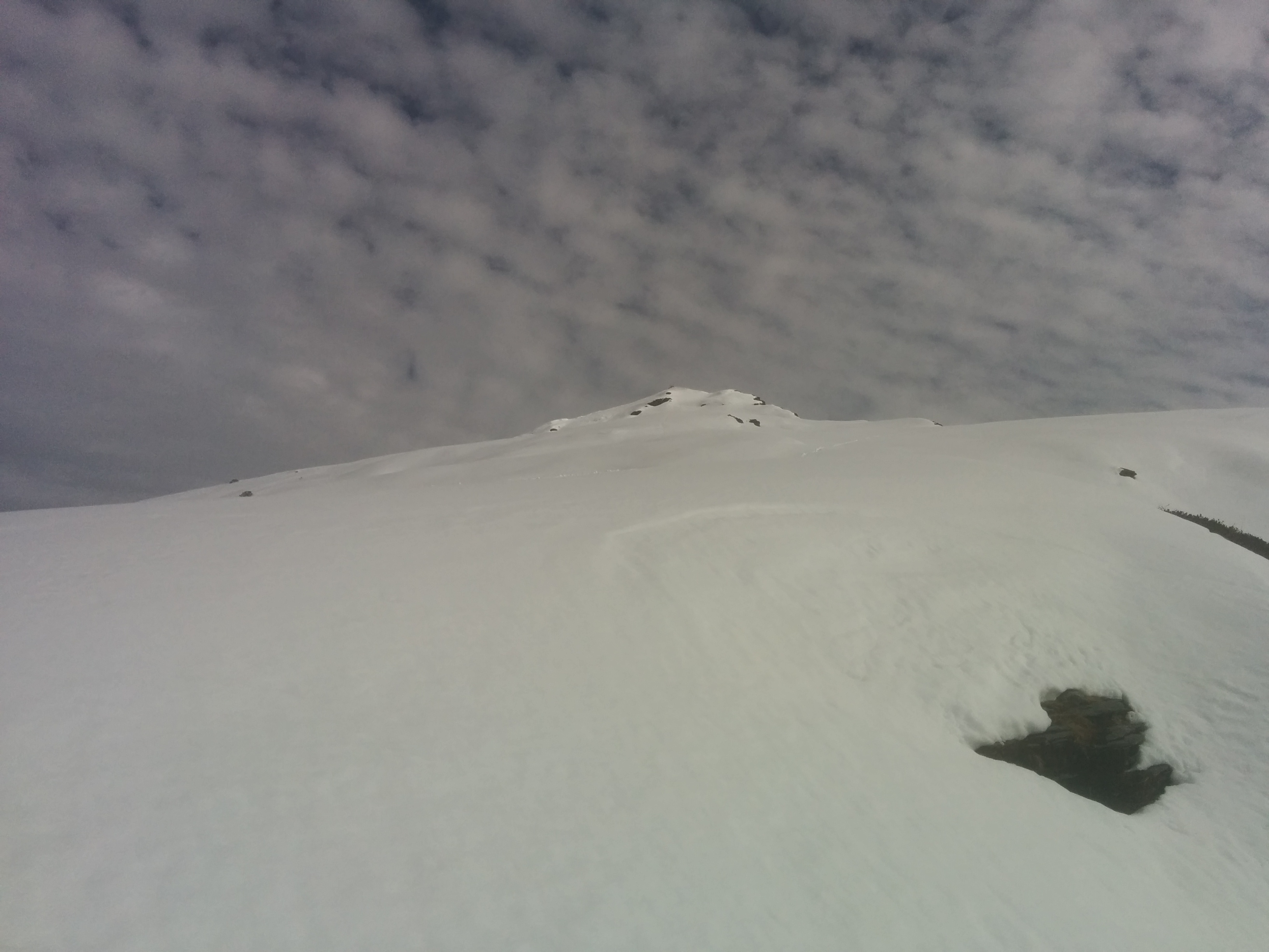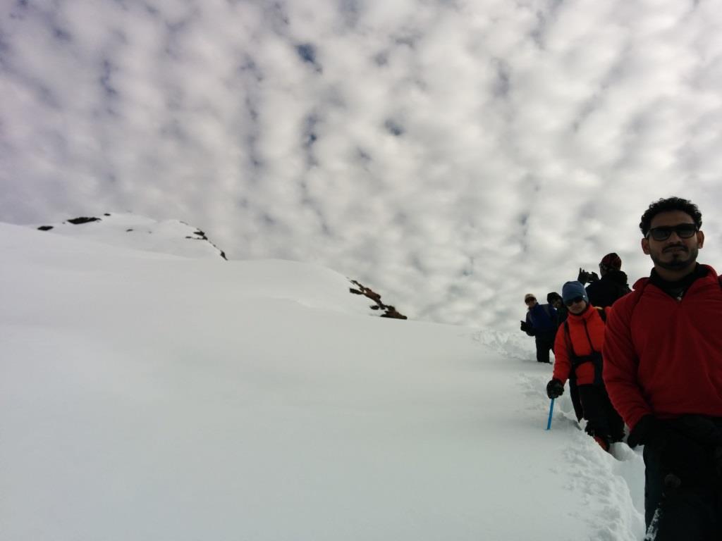 Mr. Negi started leading the pack but after about 5 minutes, it was clear that he would be too exhausted doing all the step cutting work by himself. Besides, we wanted to have some fun ourselves too. So we decided to take turns in cutting fresh steps. This way, only the person leading in the front would be exhausted at a time and the rest of the group would be able to follow in the deep steps quite easily. We dragged on like this for almost 40 minutes or so before the group as a whole, started to lose faith that we could keep doing it till reaching the summit. The clock was ticking and some of the group members’ feet were freezing in the snow. We finally decided to go on till the ridge and take a call from there.