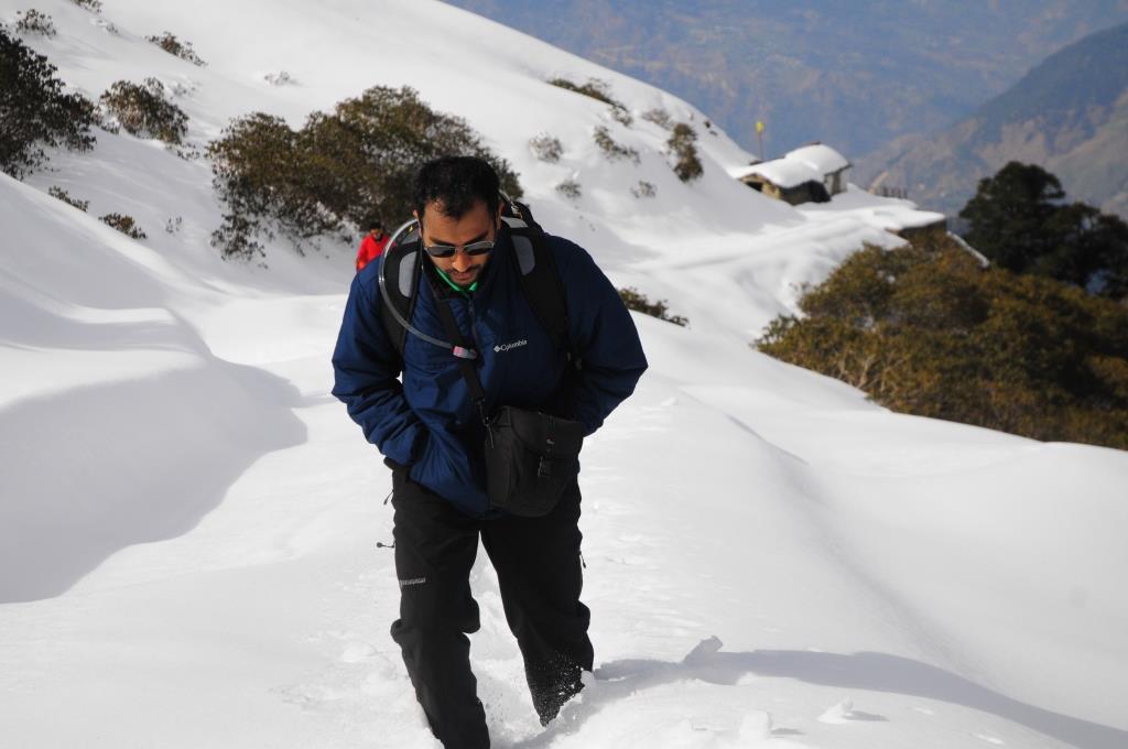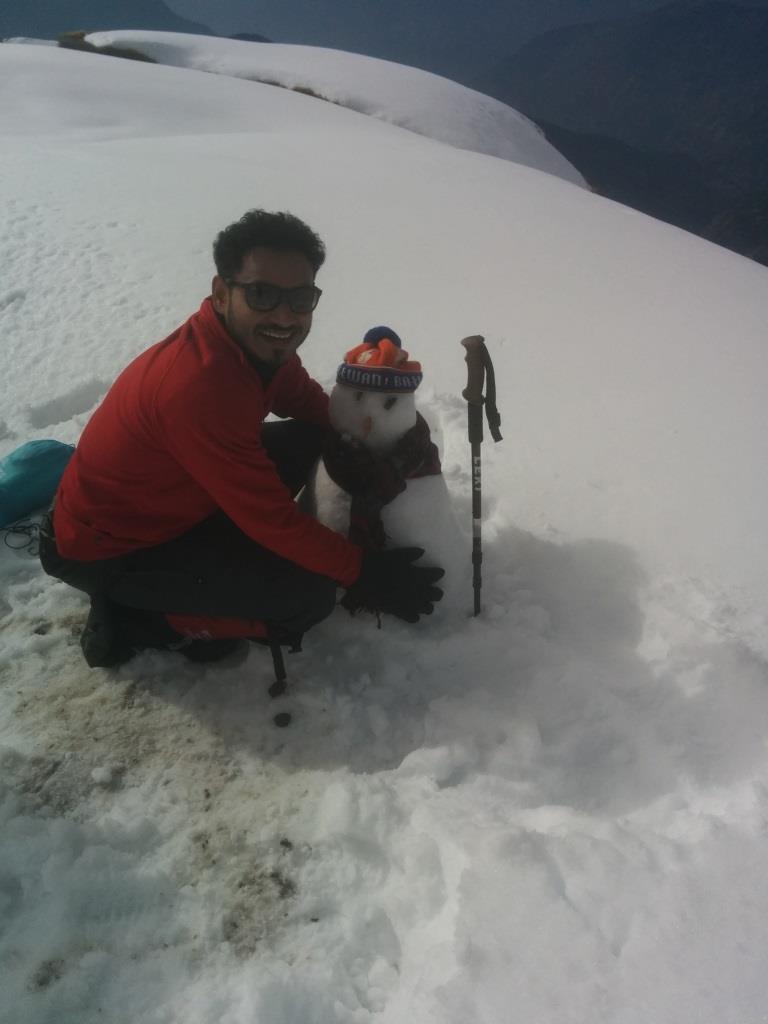 But Ashish was not ready to go back without building a snowman for his 2-year-old daughter, to whom he had promised that he would build one, when he had left home for the trek. Within 10 minutes, he built a very cute looking fella in the snow with Archana’s hat and my scarf adorning the head and the neck respectively. With that, we bid adieu to the peak and started our return journey. The 8 km long walk back to Baniya Kund was not as fast as it would have been in summer conditions. Nonetheless, we tried to glissade wherever possible on the way down and it was a lot of fun!