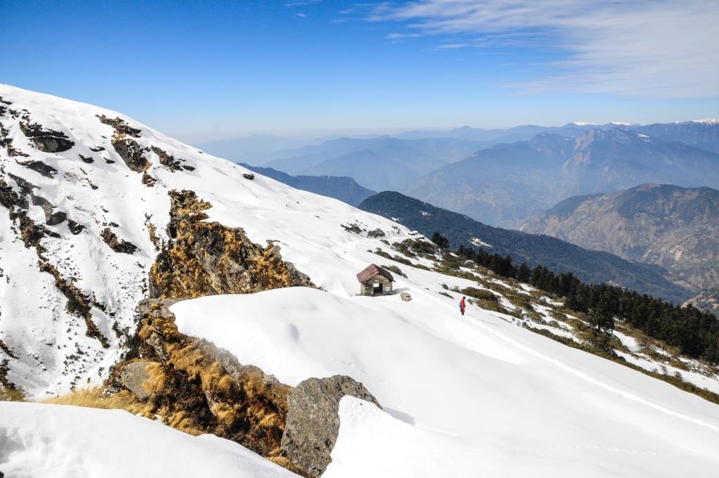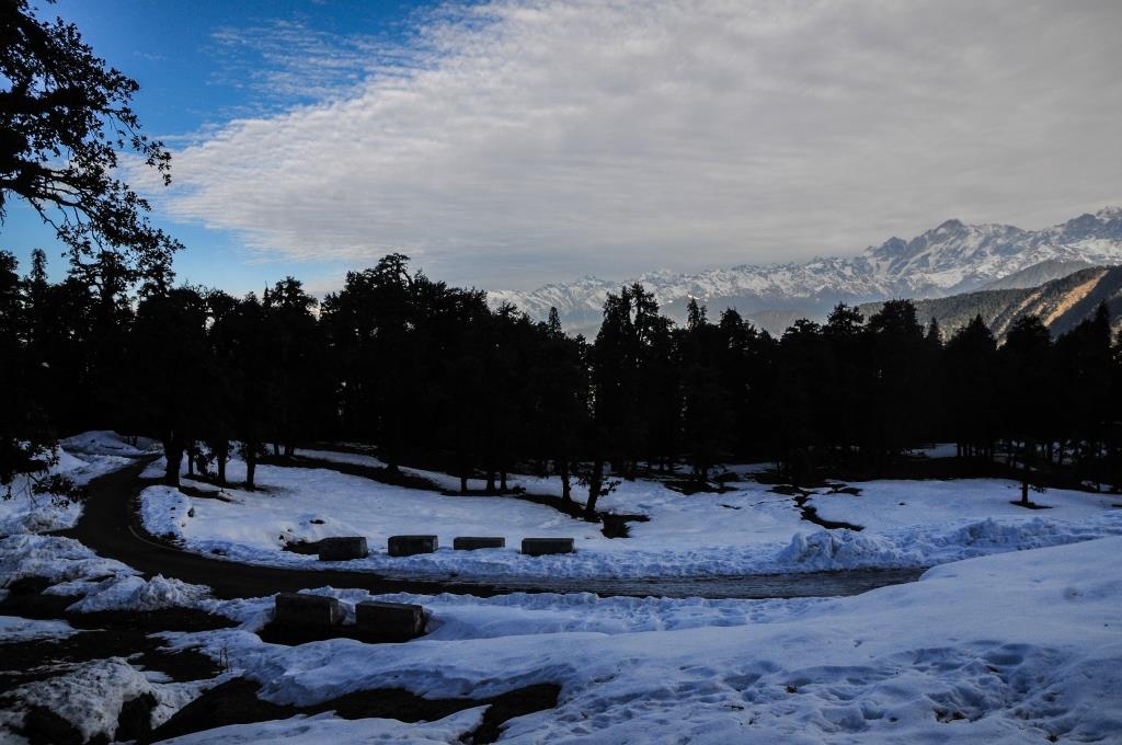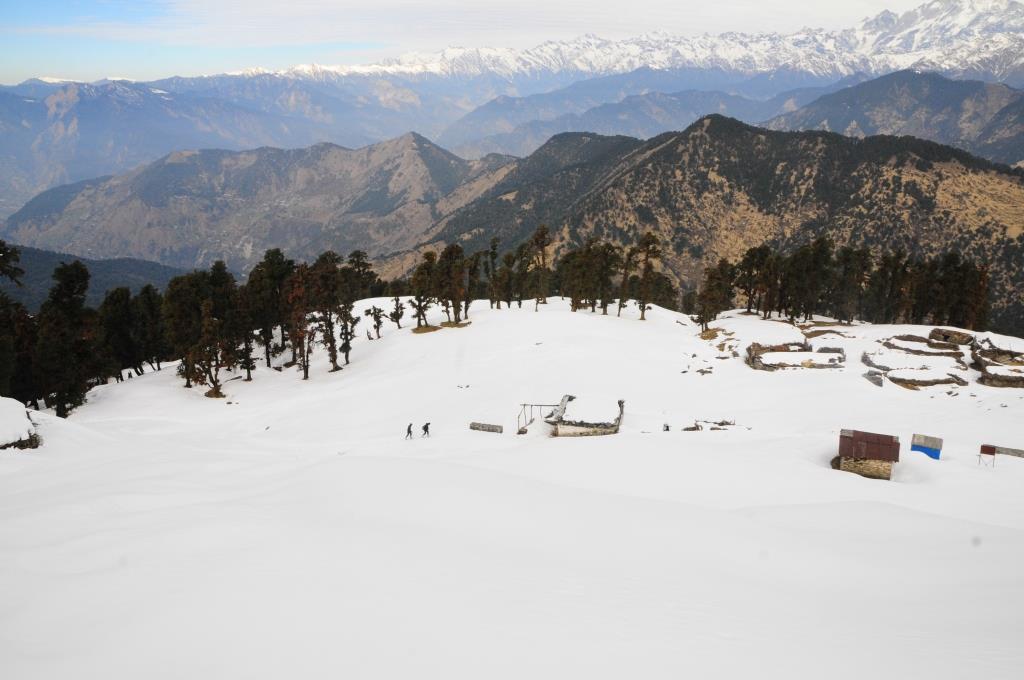 I was very glad to be there, to be plodding in the knee-deep snow, making steps with the snow boots and a rented walking stick, looking at the exquisite panorama on my left side on the horizon and vainly trying to chart a possible path to the peak that lay vertically above my nose. Although we were taking turns in opening the route in the snow, the progress was very slow and it was becoming apparent that the peak lay out of reach if we were to go back to the base in safe time. We had started walking roughly around 9 a.m. that day from a place called Baniya Kund. Having covered about 6.5 km from there to Tungnath temple(12,000 ft), we had decided to attempt climbing Chandrashila peak which stands roughly a kilometer high behind Tungnath, as if guarding the highest Shiva shrine. We had passed Chopta about 3 km after leaving our car behind at Baniya Kund and renting the snow shoes and walking sticks at a shop there. From Chopta onwards, the trail had been covered under snow, although it was not knee-deep till we reached Tungnath. Still, walking on snow was a much larger effort compared to walking up a trail in the summer, with everything around you reflecting a bright while instead of a refreshing green!