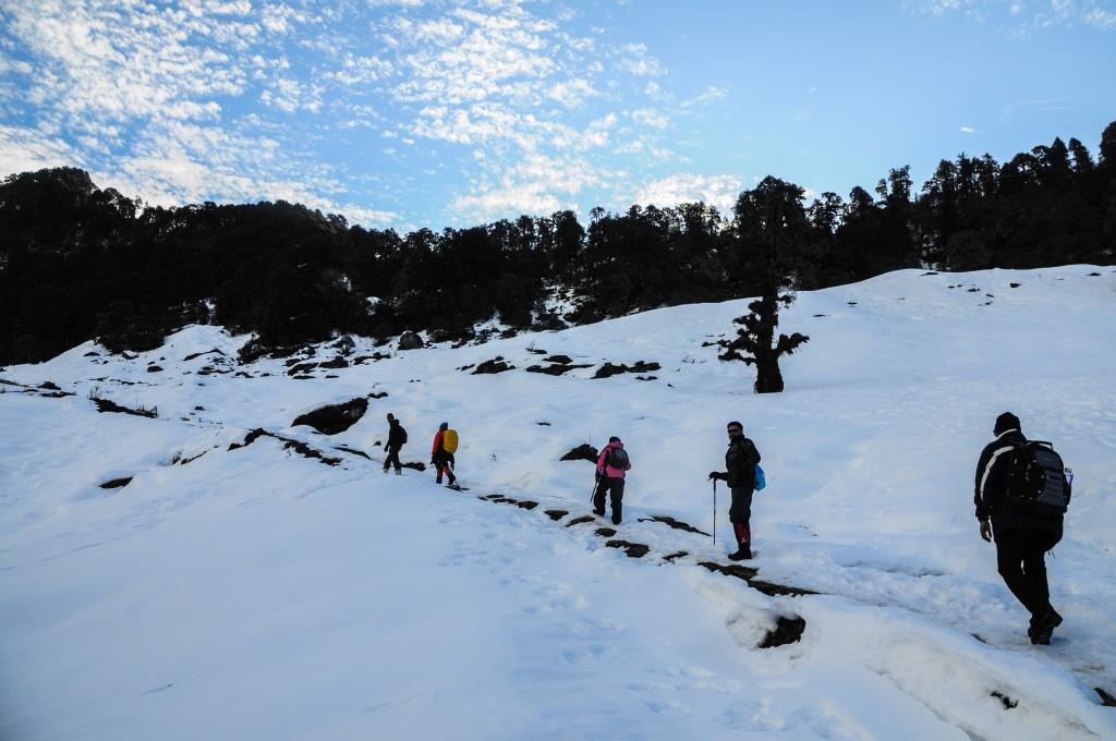 The rented shoes were not working that well for a few of the group members – they had already started leaking the water inside and my friends’ socks were drenched in water. Estimated time needed to climb the peak from Tungnath was 1.5 hours as per our guide, Mr. Negi. Although the distance that we had to cover was only 1 km, the climb was going to be uphill – we were going to be on the mountain face from then on. The most difficult part about the climb was going to be having to break open the trail as nobody had gone up that route after the latest snow fall. We were not confident about making it to the top but wanted to give our best shot at the climb; so we set off for the final leg of the trek around 1 p.m., after a lunch break around the temple.