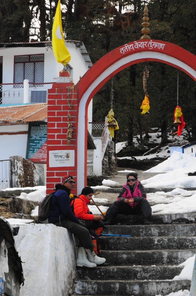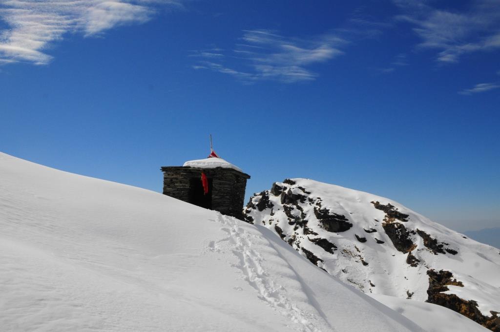 With very few breaks in between, we had reached Tungnath by about 12:30 p.m. The last one km to up to the temple had seemed unending as the snow had started to become deeper. The snow trail in this part of the hike was very narrow and it felt like we had to do a cat walk as one foot had to be kept directly in front of the other due to the narrow width of the trail. At times, even the hand-railing, meant for the support of the hikers, was almost covered under snow – the layer of snow was so thick and deep that we were walking at the level of the top of the handrail at many a places. The gradient of the trail from Chopta to Tungnath was not bad at all – it was just that there was a hell lot of snow. From Baniya Kund to Chopta, the trail had been comparatively much easier owing to less snow. Thanks to our guide, we had taken a short cut in the mountains, thereby lessening the distance we had to cover from Baniya Kund to Chopta. Without the shortcut, we would have had to keep walking longer on the tar road that was covered under snow. Overall, the hike till Tungnath had been easy, terrain wise and moderate, effort wise. I would rate the trail from Tungnath to Chandrashila as difficult, only because of the extra effort required to open the route. At no point was this trek close to being dangerous in terms of terrain.