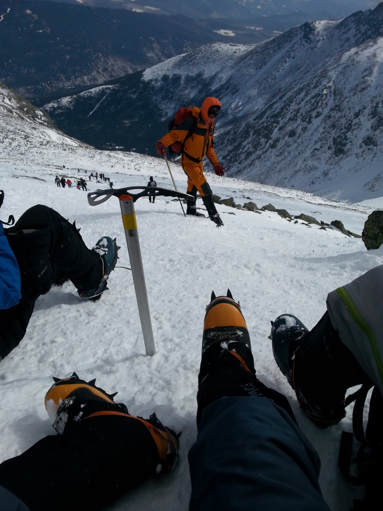 We had two and a half guides between the 6 of us (the package was that for 1 guide per 3 people, the third guide was an intern guide). The Tuckerman Ravine trail starts out steeply and is snow-covered from the beginning itself. Within the first 15 minutes, it became clear that Rich and I were relatively slow hikers compared to the other 4 members in the group. For the first hour and half, the trail was quite wide. At times, it even felt like a snowmobile could pass over it easily. The trail went up and up, zig zagging the mountain steeply. Uphill walking warmed our bodies up in no time. One by one, we peeled off our layers in -10 degree Celsius! Luckily for us, the wind was not in its usual form that day. On my back, I had a day pack containing crampons, ice axe, 2 litres of water, snacks for the day, an extra pair of gloves, a spare snow hat, sunglasses and sunscreen lotion. My group was setting a very fast pace (because the guides were walking superfast) but I could walk comfortably and consistently only if I followed my own slower pace, which is what I did. That meant that the distance between myself/ Rich and the rest of the group went on increasing with every passing minute. After a point, I stopped trying to catch up as the effort of having to walk consistently uphill on the snow with the heavy snow boots was an onerous task in itself. We had started at about 2000 ft altitude at the visitor center and would have to go up another 4000 ft before we reached the summit. I started to set my pace in order to be able to last till the summit. To this moment, it’s difficult for me to judge if my group was super-duper fit or if my own stamina was so bad that I was finding it very difficult to walk at the same pace as the others in my group. In any case, I kept walking, one step at a time – this was only the first one-fourth part of the climb.