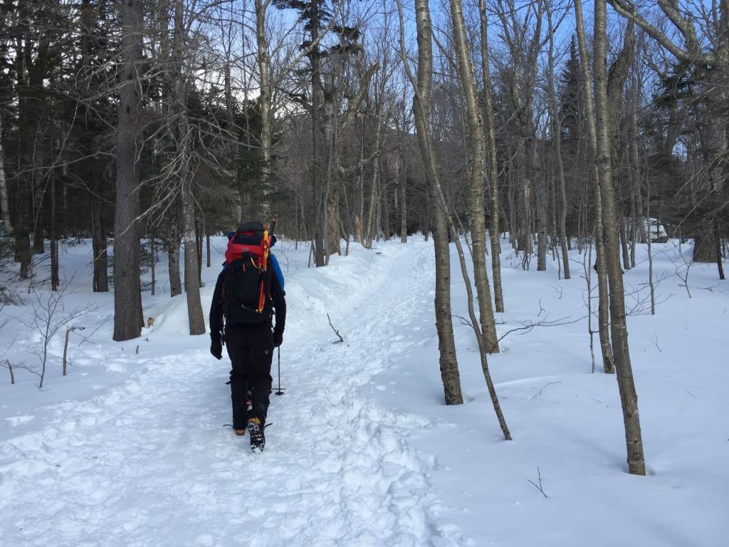 As per the itinerary, the 6 of us assembled at International Mountain Climbing School at 6:30 a.m. on Saturday – (yes, we could get only 3 hours of sleep after a 7-8 hour-long drive the previous night). Although we were not supposed to hit the trail before 9 a.m., we still had to fit the gear – meaning, we had to find the correct size of snow boots, crampons, down jacket and any other missing piece of gear at the climbing school, under the supervision of our guides for that day. After spending a good 2 hours in this activity (no idea why it took so long!), we drove up to Pinkham Notch Visitor Center – the trail head for Mt. Washington and hit the Tuckerman Ravine trail at 9:30 a.m. Lion’s head Winter route is the standard route in the winter season. It beings with a 1.7 miles long walk on Tuckerman trail in the beginning after which, one hits the intersection of Tuck’s trail with Tuckerman Ravine Fire road.