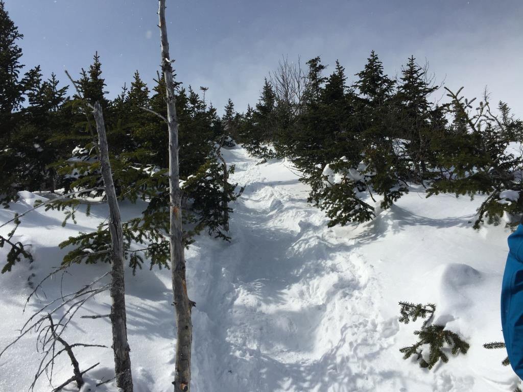 With the crampons beneath the shoes and ice axe in my right hand, I tried to put my game face on and started walking on the trail through the spruce forest. Within the next 5 minutes, the trail became very steep and narrower than before. We had started to use the French side stepping technique in order to make the optimum use of energy/ muscular power while stepping uphill with crampons. This section of the trail lasted for about 20 minutes. Being quite steep, everyone had to make use of the ice axe as well. There was a small rock step where we had to plant the ice axe above our head or use our hands for a few moves. It was a bit scary but added to the adventure of the hike. It is because of such a mix of hiking and semi technical climbing on different kinds of snow, that Mt. Washington winter hike is called a mountaineering hike. Since the day was sunny, a lot of people were attempting the peak that day, resulting into a traffic jam on this part of the trail. But again, I welcomed the rest stops that the traffic job provided us with!