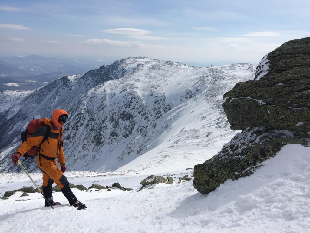 There is also a motorable road that goes up to Mt. Washington Observatory at the top of the mountain but that road is closed during winter. Now, just because I told you that there’s a man-made structure at the top and that you can even drive up in your car on the mountain, don’t start judging the difficulty rating of this peak. Let me first present you with harsh facts about this mountain. To quote www.outdoors.org, “Because the Presidential Range is in the pathway of several major storm tracks, Mount Washington is known to have a severe combination of wind and cold. The average annual temperature is 27.1°F, the summit temperature has never risen above 72°F, and the mountain holds the world-record for a wind speed of 231 mph, recorded on the summit in 1934. Hurricane-force wind, dense fog, driving rain, and snow occur even during the summer months, and sudden and extreme weather variations are common.” Several people have died on this mountain, in fact a woman had died just the previous week, on account of having gotten stranded by herself in bad weather on the mountain. So, even with a summit of as low an altitude as 6288 ft, this peak tests your endurance and mountaineering techniques really well! I’d say that it’s a great winter peak for those who are training for mountain climbing – you have to use snow boots, crampons, ice axe and brave the negative temperatures pretty much the whole time on the summit day.