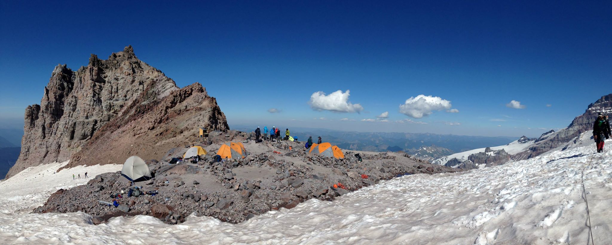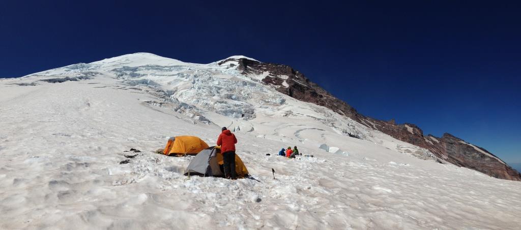 The next 1 hour was very tiring as we kept gaining height and digging our feet into the snow. Although our walk up the mountain was made easier by the perfect steps that Joe was stomping in, we had started to become impatient with the exertion and eagerly awaited arrival at the campsite. We had been walking for almost 7 hours by then and had covered about 4-5 mountain miles.The weather had been favorable throughout and we welcomed the fact that we didn’t have to deal with either low temperatures  or precipitation of any form. At about 4 o’clock, we could spot Camp Schurman(9440 ft) in some distance to our right (facing the peak). Although the common route from lower Emmons to Camp Schurman passes via a hillock full of loose rock and scree, we avoided that route and didn’t leave the glacier till we reached Camp Schurman from its side, instead of its back (the hillock side). It was a relief to finally reach  the gorgeous campsite that is nestled on a rocky ridge.