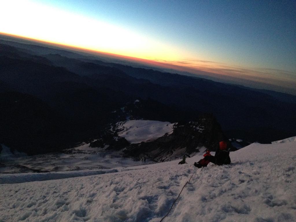 Around 4:30 a.m., we found ourselves on a traverse. I am not sure about this but it was possibly the traverse leading towards the saddle between Liberty cap and Columbia Crest (the summit). I feel that this was one of the most comfortable spots on the mountain to rest and enjoy the vista around us. Visibility had improved as the Sun was breaking and after the first few hours of constantly going up and up with our necks down, it felt good to be on a relatively easy traverse. We took a short break for snacks and pictures and soon, got back to climbing. We were only halfway through at this point. Didn’t I tell you at the beginning that a ‘circuitous’ path lay ahead of us!