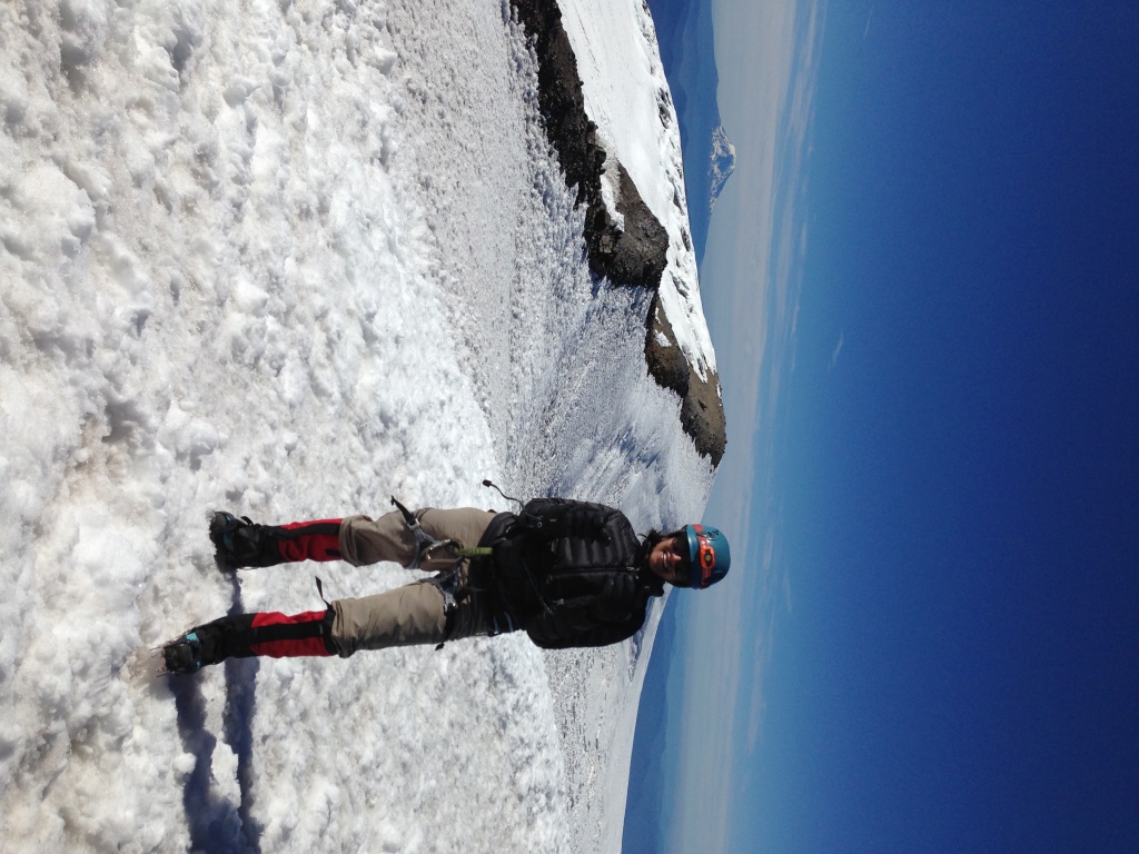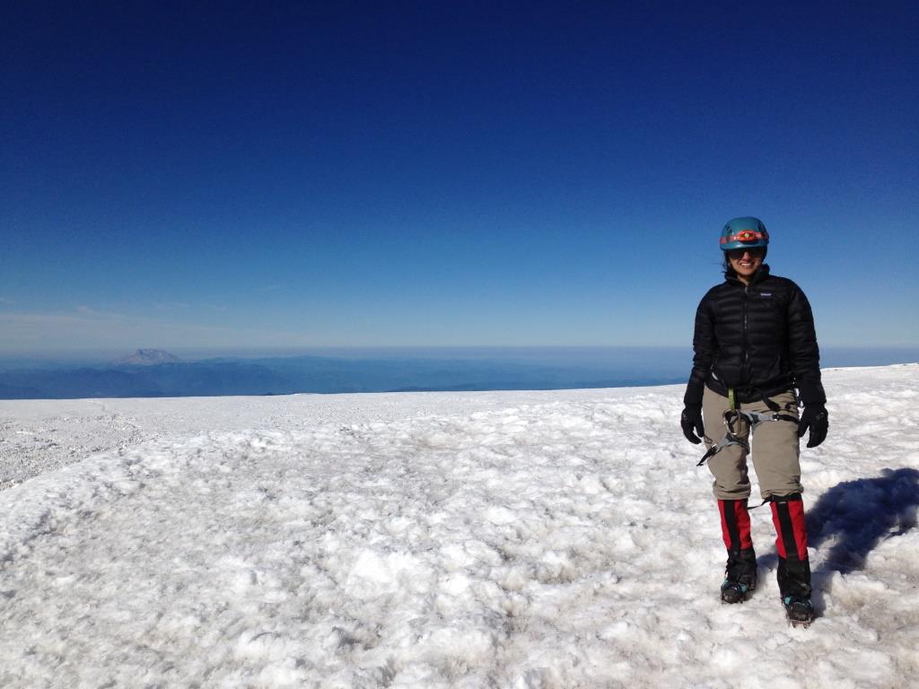 On the summit of Mt. Rainier with Mt. Helen in the far distance behind me to your left – it’s just a speck.