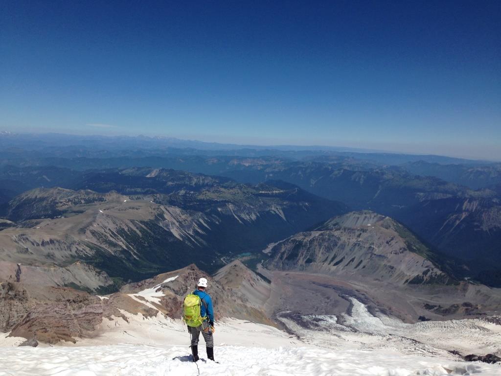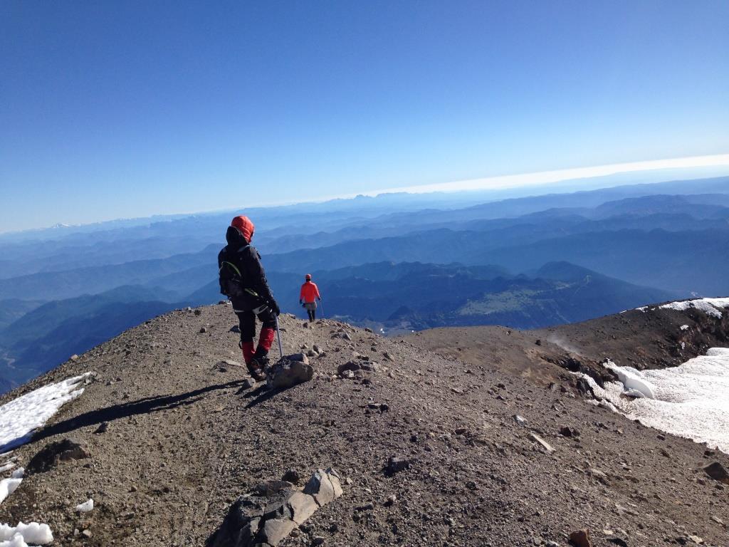 On the summit of Mt. Rainier with Mt. Adams seen far away in the background