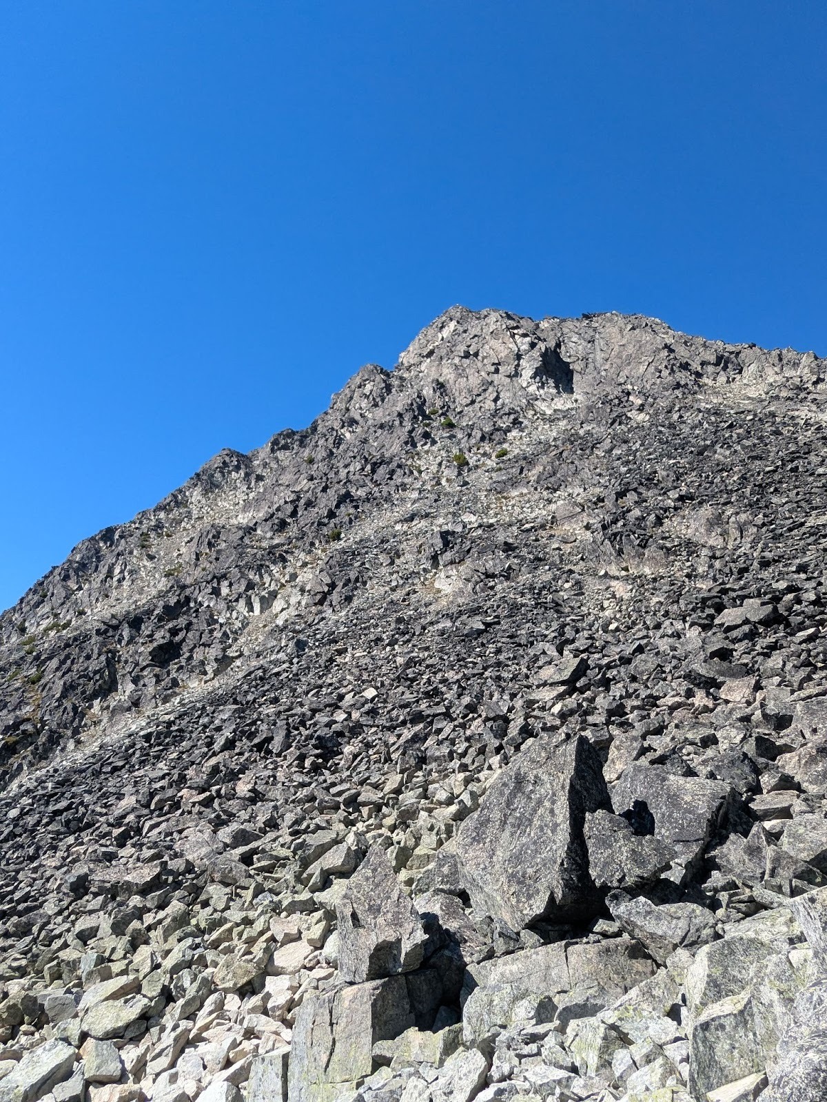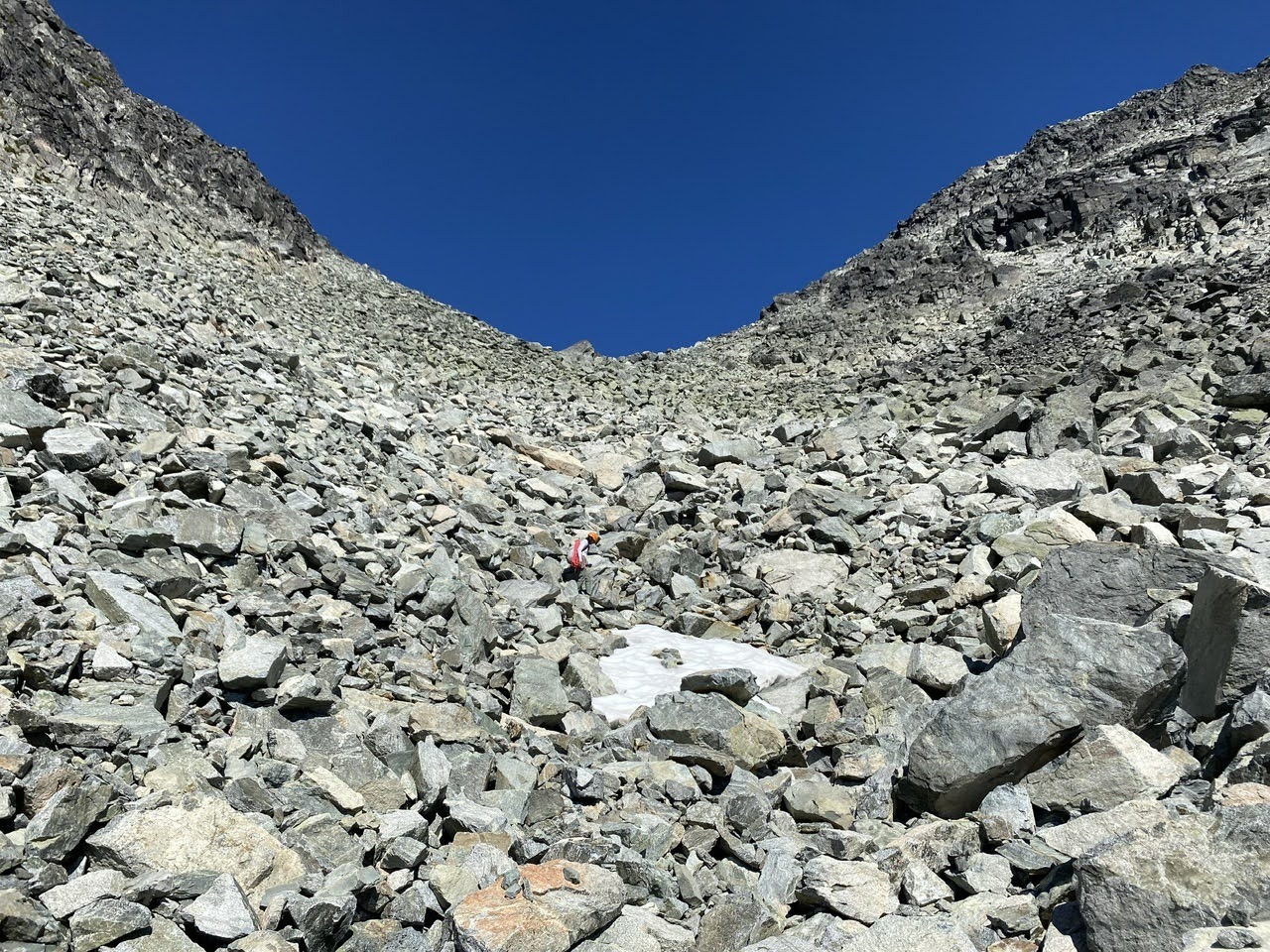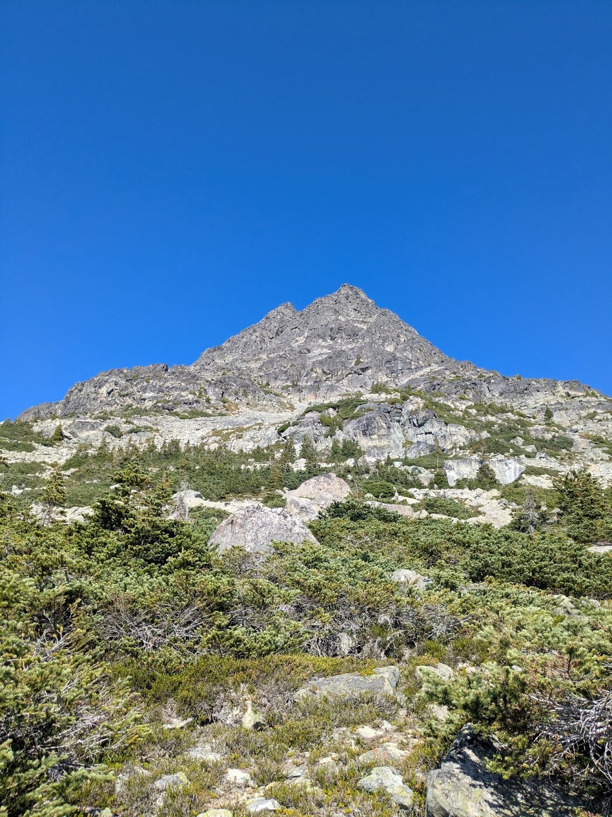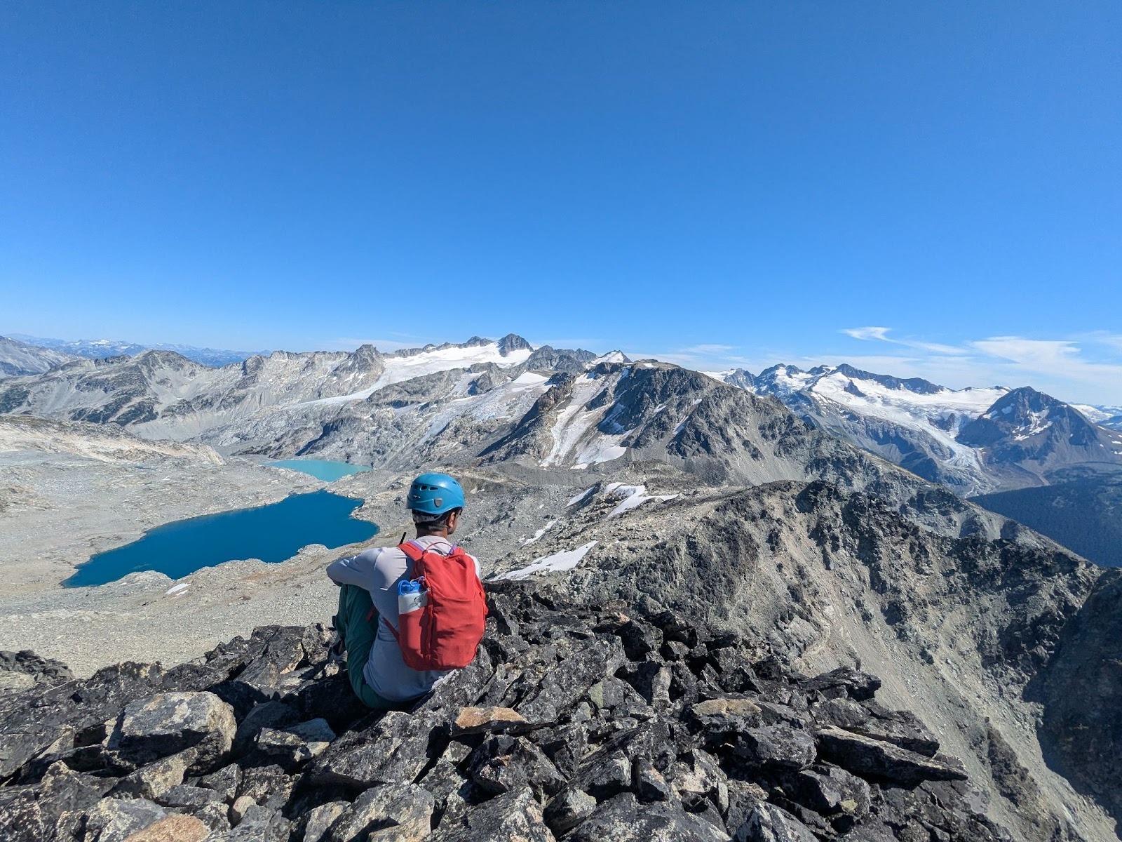 We celebrated with food, photos, and some quiet time taking in the lakes and peaks all around us. Eventually, we started the descent – boulder-hopping down to the col between Blackcomb peak and Disease ridge and then picking our way down loose rock in the gully. The downhill scramble felt monotonous. Ninety minutes later, we were back at Blackcomb Lake.
