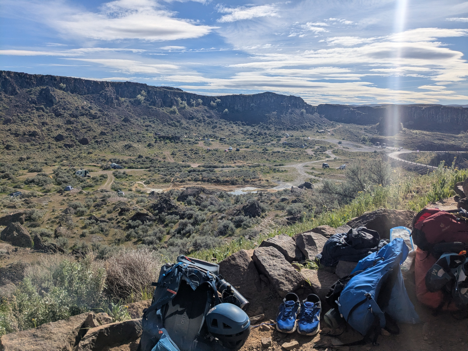 Being one of the earlier parties on the scene, we could snag a nice spot for two cars and two tents in the middle of the campground. While waiting for the rest of the group, we enjoyed a peaceful lunch while admiring the view of the Feathers climbing area and the sage bush-filled land around us. An hour or so later, it was time to rack up. A little later, the rest of our group would meet us directly at the crag.