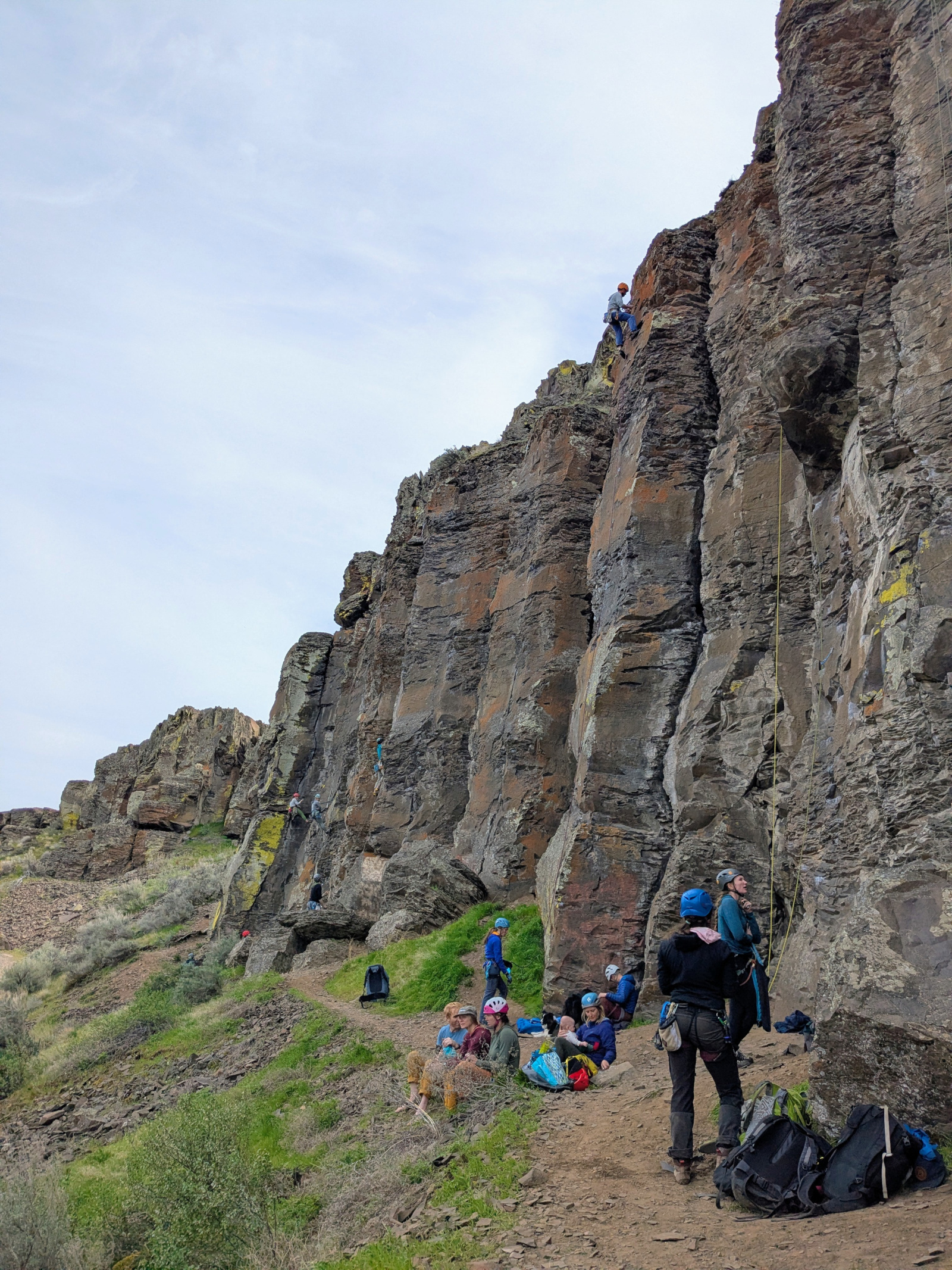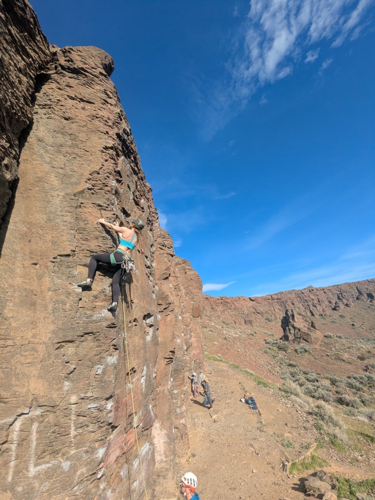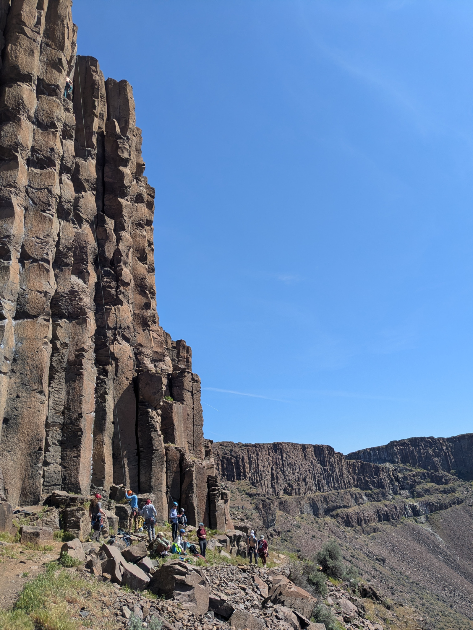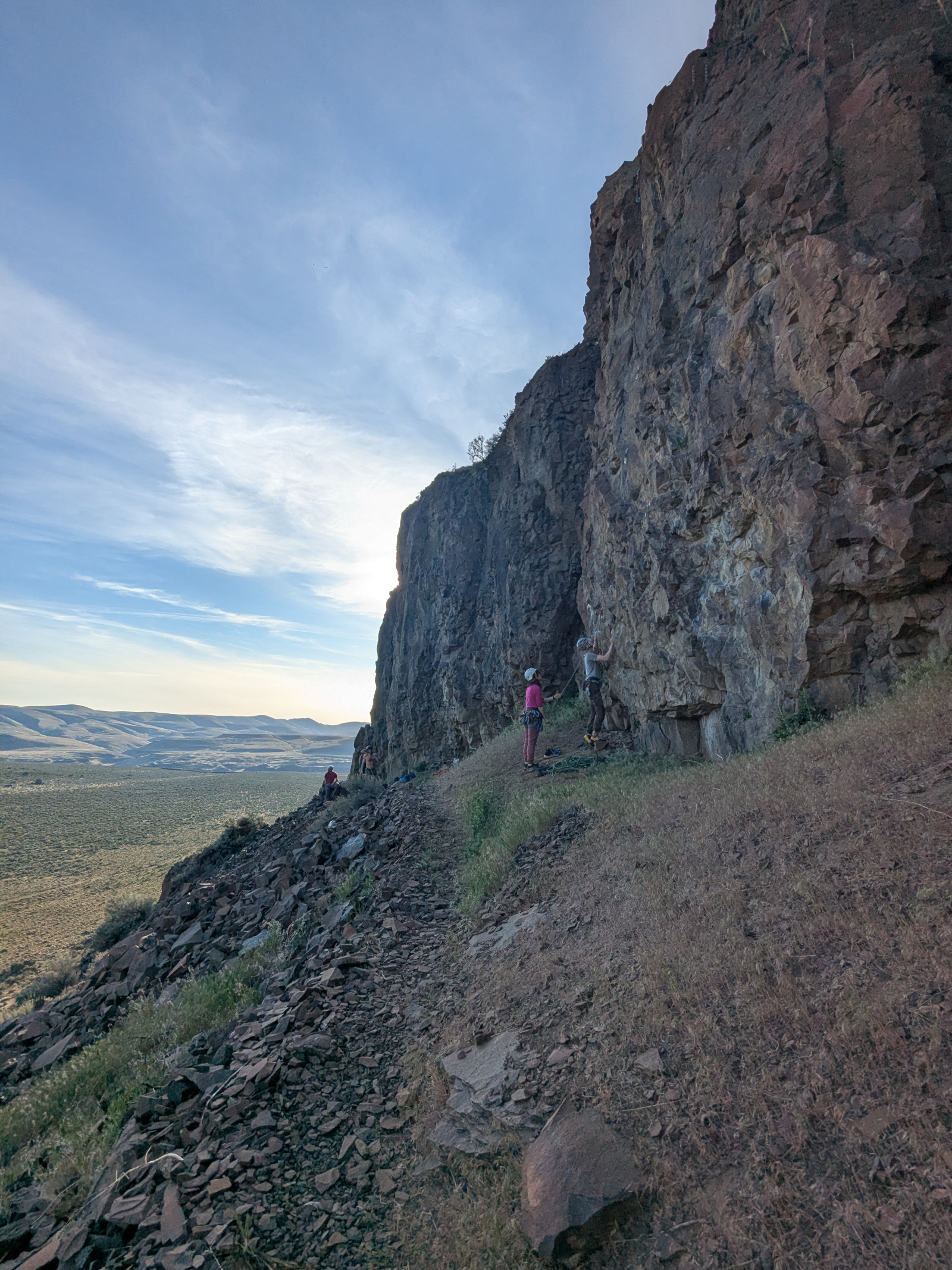 Across from the crag, you can see the wide expanse of the Echo basin extending all the way into the Columbia river. The sky was an azure blue with a hawk soaring on thermals, and pigeons watching the climbers from the tops of the columns.