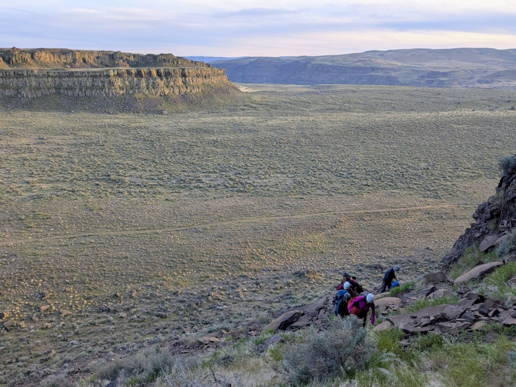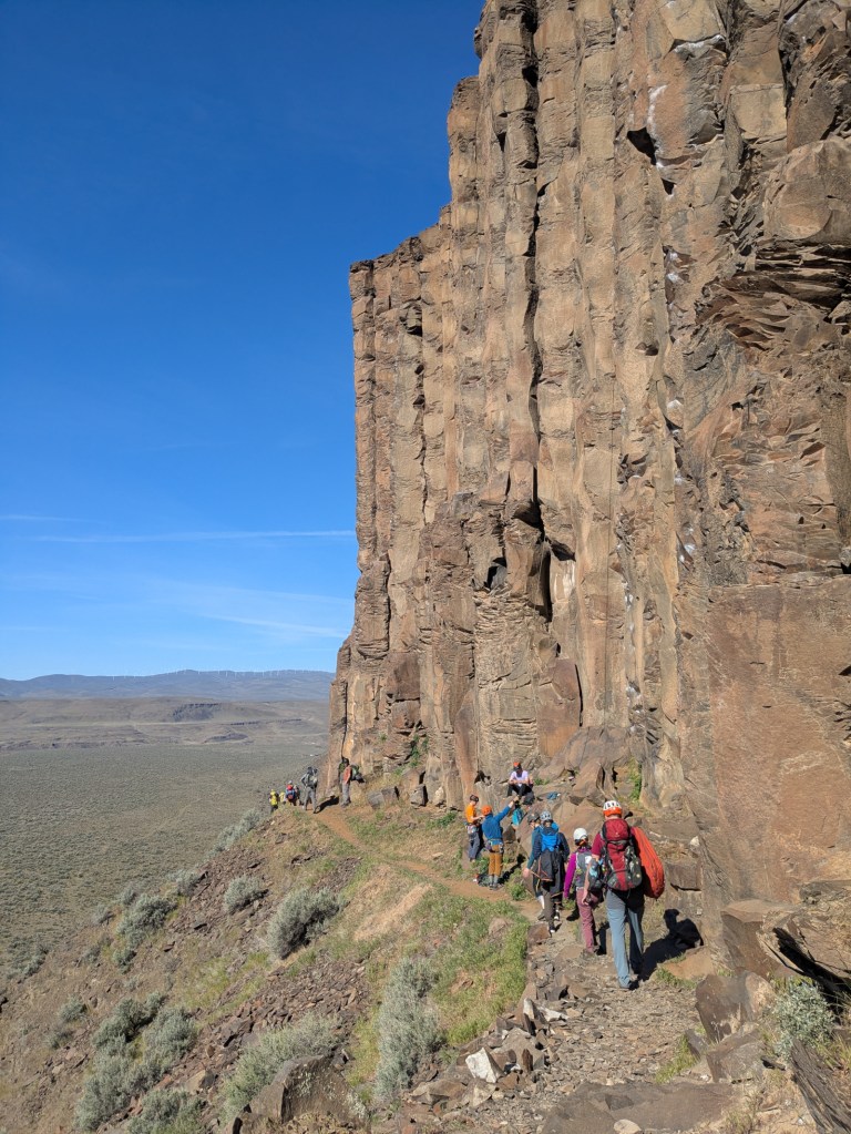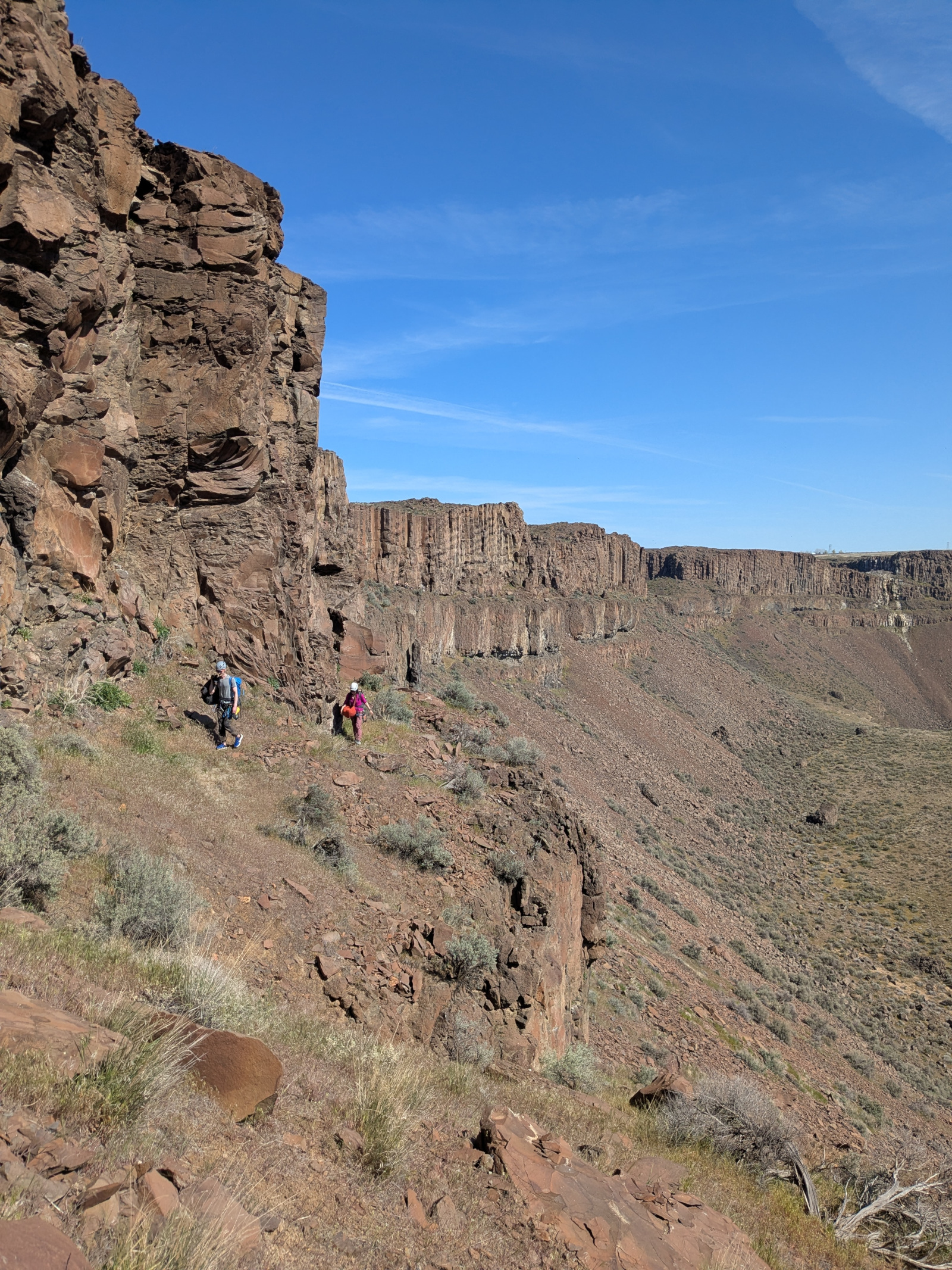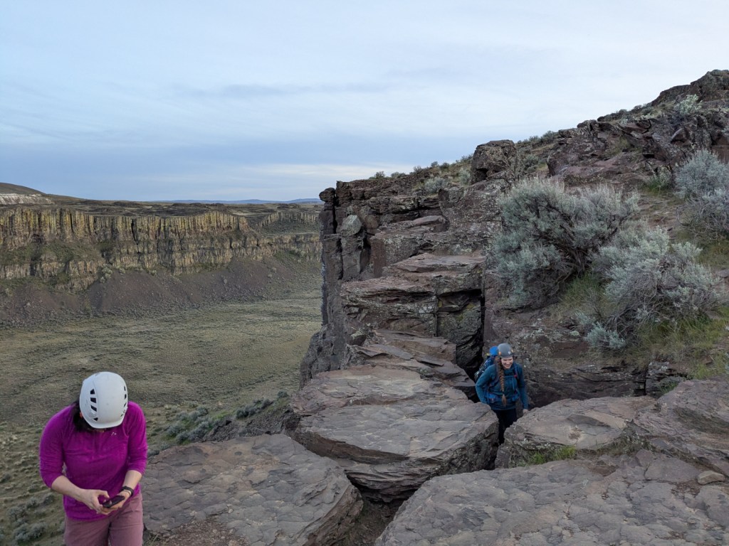 Across from the crag, you can see the wide expanse of the Echo basin extending all the way into the Columbia river. The sky was an azure blue with a hawk soaring on thermals, and pigeons watching the climbers from the tops of the columns.