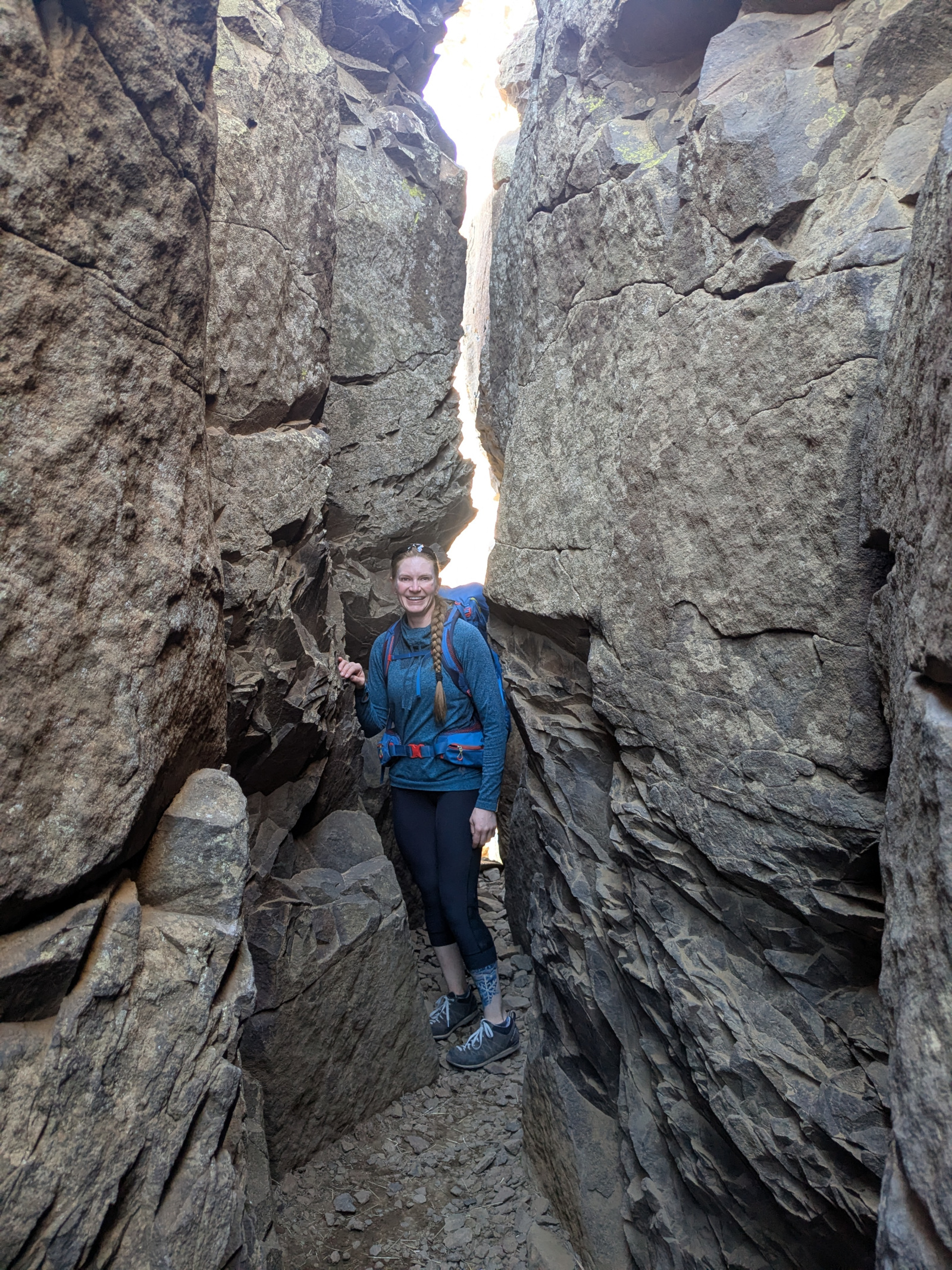 The roughly 30-min hike to the crag had us walking up a well-defined hiking trail to the top of a mesa. The longleaf flox flowers were in full bloom and the plateau was dotted with them. We walked a bit further until arriving at a rock slot/crevice that ultimately deposited us at the base of the columns. From this point on, we took the skier’s right on the trail to get to the Sunshine Wall. The trail hugs tall basalt pillars on the right while a wide basin spreads out a few hundred feet below you to the left. The area is incredibly beautiful, and I couldn’t stop myself from snapping multiple pictures.